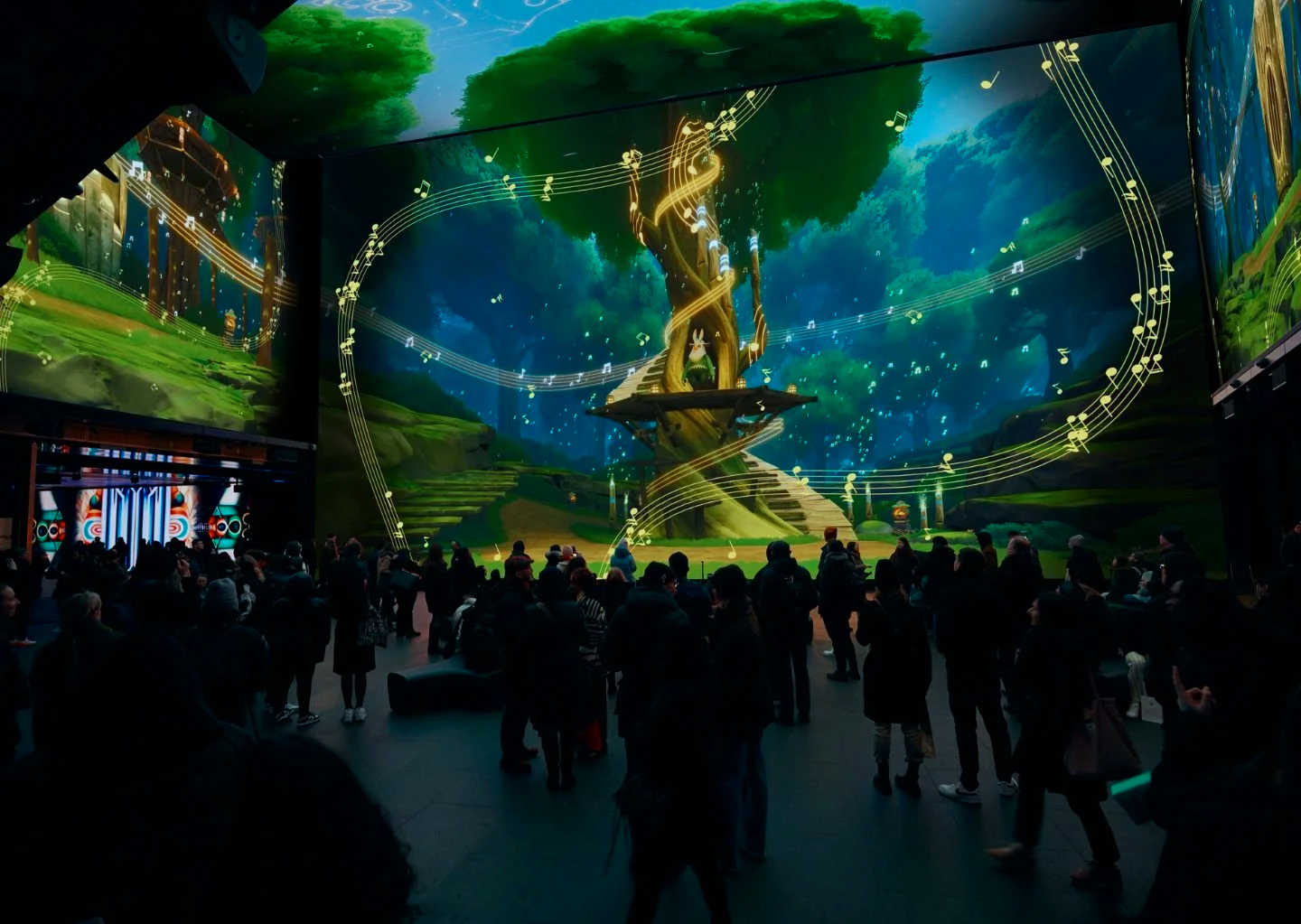 Enchanted Forest: The Melody of Spirits at Outernet London invites visitors into an interactive, immersive world where a silent forest comes back to life through collective music-making. Guests generate spirit characters via QR codes and trigger sound layers in real time—creating evolving orchestral compositions.